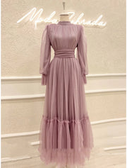 Wholesa A-Line Prom Dresses Elegant Dress Formal Ankle Length Long Sleeve High Neck Tulle with Pleats Ruched