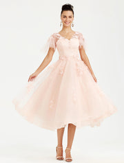 Wholesa A-Line Prom Dresses Elegant Dress Wedding Guest Cocktail Party Tea Length Short Sleeve V Neck Tulle with Appliques