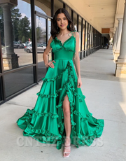 Wholesa A-Line Spaghetti Straps Ruffles Satin Green Long formal dresses evening gown Prom Dress with Slit