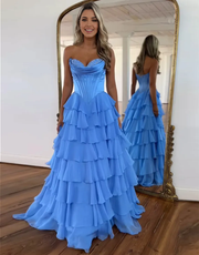 Wholesa A-Line Strapless Corset Tiered Long formal dresses evening gown Prom Dress with Slit - US 2 / UK 6 / EU 32 / Blue