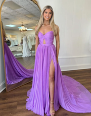 Wholesa A-Line Strapless Ruched Hollow Out Purple Long formal dresses evening gown Prom Dress with Slit