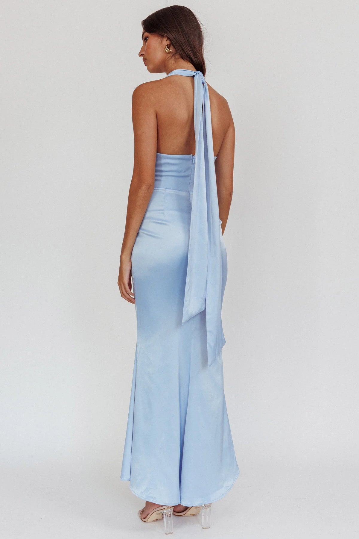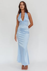 Elegant Mermaid Deep V Neck Pleat Bodice Halter Neck Sage Sleeveless Backless Inexpensive Long Wedding Guest Dress Hot Sale Prom Dress - Light Blue / US 2 / UK 6 / EU 32