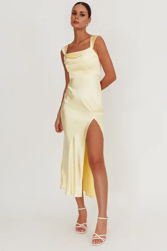 This off shoulder satin dress exudes elegance and sexiness. The off shoulder design showcases charming shoulder and neck lines, adding a romantic atmosphere; The lace up and backless design on the back further unleashes its sexy charm while also having adjustable practicality. The slim fit fits the body, perfectly outlining graceful curves. The side slit design reveals the leg lines while walking, adding a touch of charm. The smooth satin fabric has a great drape, shining softly in the light, and the skirt is as agile and flowing as water when walking. Whether it's a banquet, party, or wedding, you can be the center of attention and exude a unique fashion charm.