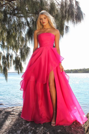 Glamorous Tulle A Line Strapless Tiers Ruffles With Split Evening Gowns Elegant Long Prom Dress