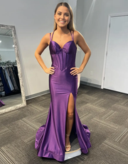 Wholesa Mermaid Double Spaghetti Straps Corset Satin Purple Long formal dresses evening gown Prom Dress with Slit