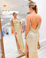 Wholesa Mermaid Spaghetti Sparkly Straps Sequins Gold Long formal dresses evening gown Prom Dress with Slit - US 2 / UK 6 / EU 32