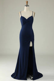 Wholesa Mermaid Spaghetti Straps Long Prom Dress with Slit - Navy / US 2 / UK 6 / EU 32