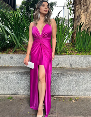 Wholesa Mermaid Spaghetti Straps Ruched Satin Fuchsia Long formal dresses evening gown Prom Dress with Slit