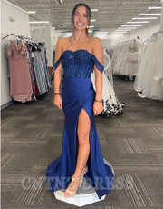 Wholesa Mermaid Sparkly Off the Shoulder Corset Navy Long formal dresses evening gown Prom Dress with Slit