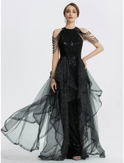 Wholesa Mermaid / Trumpet Prom Dresses Black Dress Dress Quinceanera Floor Length Short Sleeve Jewel Neck Tulle with Beading