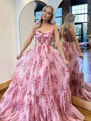 Romantic Formal Women's Dresses Pink Chiffon Floral Printed A Line Spaghetti Strap Sweetheart Sleeveless Ruched Bargain Long Prom Dress