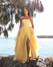 This dress is a bright choice to light up a banquet, featuring a fresh light yellow tone that is gentle and eye-catching like the morning sun. The strapless design highlights elegant shoulder and neck lines, while the pleated craftsmanship on the upper body adds a delicate touch; The skirt is made of multiple layers of organza to create a fluffy and layered look, paired with a high slit on one side, making it both agile and sexy while walking. The fabric is lightweight and has a good drape, whether it's a seaside dinner or a high-end social occasion, it can showcase your unique fashion taste and charming aura, making it the perfect choice to showcase your personality and charm.