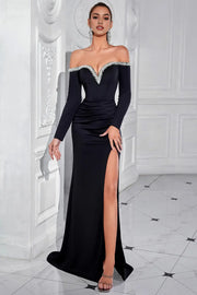This black off shoulder dress is a perfect fusion of elegance and sexiness. Using high-quality fabrics, it provides a snug and comfortable fit while perfectly outlining curves. The off shoulder design is paired with a delicate rhinestone decorative collar, resembling starlight in the night sky, shining brilliantly and revealing charming shoulder, neck, and collarbone lines. The long sleeved design adds a touch of gentleness, while contrasting with the high slit skirt. During walking, the beautiful legs at the slit are faintly visible, emitting a deadly temptation. Whether it's a dinner party, red carpet, or high-end party, it can help you become the center of attention and unleash your unique charm to the fullest.