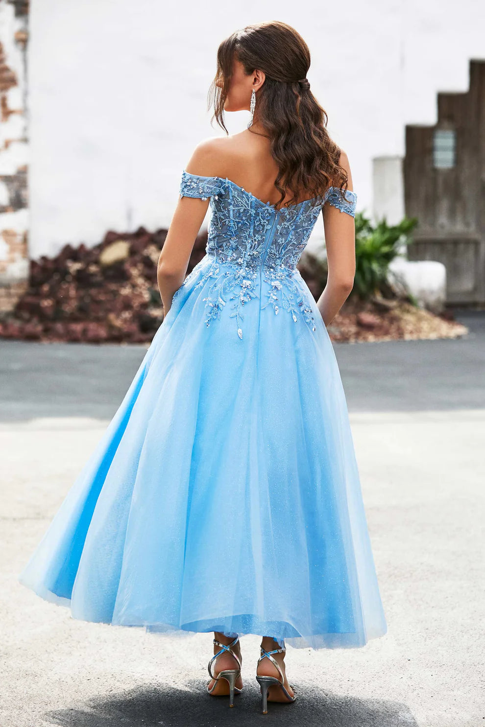 This dress features a clear ice blue color as its main tone, seemingly blending the morning mist with the sparkling crystal, perfectly interweaving elegance and fantasy. The off shoulder design paired with lace sleeves is fresh and elegant. The three-dimensional lace embroidery and sequin decoration on the upper body are exquisite and complex. The delicate lace texture and sparkling sequins intertwine, outlining the beautiful curves of the chest and showcasing the gentleness and delicacy of women. The waist cinching design naturally conforms to the body shape, quietly raising the waistline and creating a slender body proportion. The skirt is made of mesh material with fine shimmer, which has excellent drape. The length reaches the middle of the calf, and when walking, it feels like a light blue wave, retaining the ceremonial feel of the dress while adding a touch of agility and playfulness. The backless design on the back echoes the shoulder less style on the front, with lace decorations extending to the back. The exposed beautiful skin on the back injects a charming charm into the overall look, and when turned around, it can instantly amaze the audience.