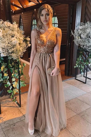 Wholesa A Line Brown Beaded Sweetheart Tulle Backless Long Prom Dresses - US 2 / UK 6 / EU 32