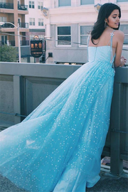 Wholesa A-Line Elegant Straps Light Blue Long Prom Dress with Stars