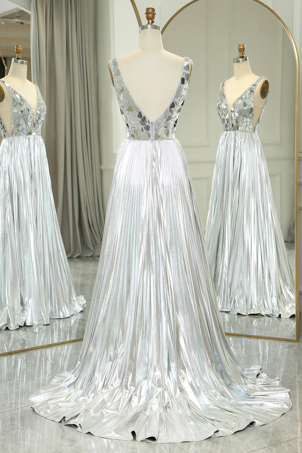 Wholesa A-line Glitter Backless Long Mirror Prom Dress