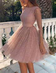 Wholesa A-Line Glittering Cute Homecoming Cocktail Party Dress Dress Jewel Neck 3/4 Length Sleeve Knee Length Tulle with Pleats Sequin