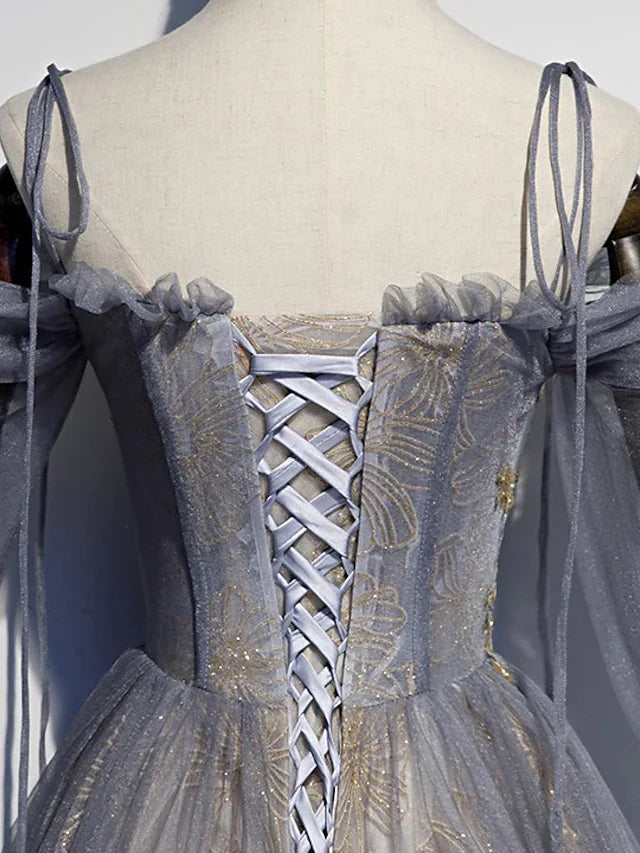 Wholesa A-Line Prom Dresses Glittering Dress Wedding Guest Floor Length 3/4 Length Sleeve Spaghetti Strap Tulle with Sequin Embroidery - US 2 / UK 6 / EU 32