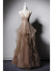Wholesa A-Line Prom Dresses Sexy Dress Formal Floor Length Sleeveless Spaghetti Strap Lace with Ruffles Appliques