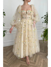 Wholesa A-Line Prom Party Dress Floral Dress Wedding Guest Engagement Ankle Length Long Sleeve Sweetheart Lace Backless with Pleats Ruched
