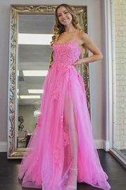 Wholesa A Line Scoop Neck Tulle Hot Pink Prom Evening Dresses with Split