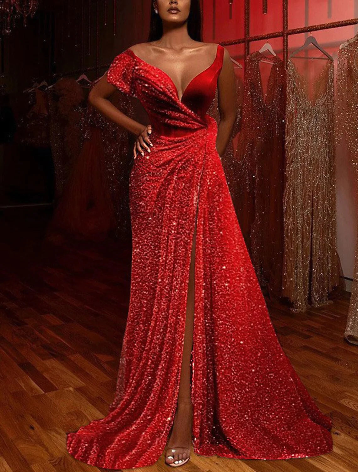 Wholesa A-Line Sparkle & Shine High Split Prom Formal Evening Dress V Neck Short Sleeve Court Train Satin with Sequin Slit - US 2 / UK 6 / EU 32