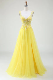 Wholesa A-line Tulle Beaded Corset Prom Dress with Slit