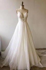 Wholesa A-line V-neck Lace Backless Prom Dresses With Court Train