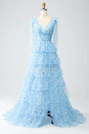 A Line V Neck Pleated Tiered Tulle Long Prom Dress With Slit