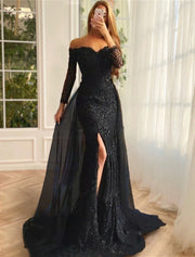 Wholesa Mermaid Evening Gown Floral Carnival Dress Formal Wedding Sweep / Brush Train Long Sleeve Off Shoulder Fall Wedding Reception Chiffon with Slit Appliques - Black / US 2 / UK 6 / EU 32