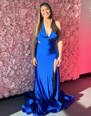 Wholesa Mermaid Halter V-Neck Satin Royal Blue Long formal dresses Bridesmaid Dresses evening gown Prom Dress with Slit - US 2 / UK 6 / EU 32