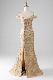 Wholesa Mermaid Off The Shoulder Long Beaded Prom Dress with Slit - US 2 / UK 6 / EU 32