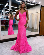 Wholesa Mermaid Sequin V-Neck Sweep Train Prom Dress - Hot Pink / US 2 / UK 6 / EU 32