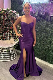 Wholesa Mermaid Spaghetti Straps Beaded Satin Long Prom Dresses With Slit