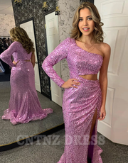 Wholesa Mermaid Sparkly One Shoulder Sequins Purple Long formal dresses Bridesmaid Dresses evening gown Prom Dress with Slit
