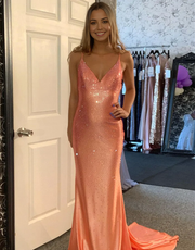 Wholesa Mermaid Sparkly Spaghetti Straps Beaded Satin Orange Long formal dresses Bridesmaid Dresses evening gown Prom Dress