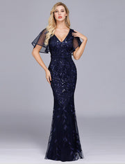 Wholesa Mermaid / Trumpet Evening Gown Empire Dress Party Wear Formal Evening Floor Length Short Sleeve Jewel Neck Tulle with Ruffles Embroidery - Dark Navy / US 2 / UK 6 / EU 32