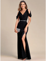 Wholesa Mermaid / Trumpet Wedding Guest Dresses Sparkle & Shine Dress Formal Wedding Floor Length Short Sleeve V Neck Lace with Sequin Slit