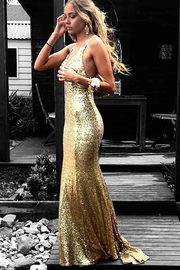Wholesa Mermaid V-Neck Backless Sequined Gold Prom Dress with Appliques