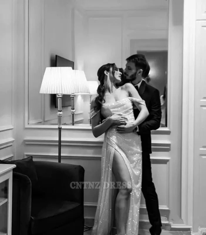 Wholesa Sheath Elegant Off The Shoulder Sequin Silver Slit formal dresses Bridesmaid Dresses evening gown Prom Dress