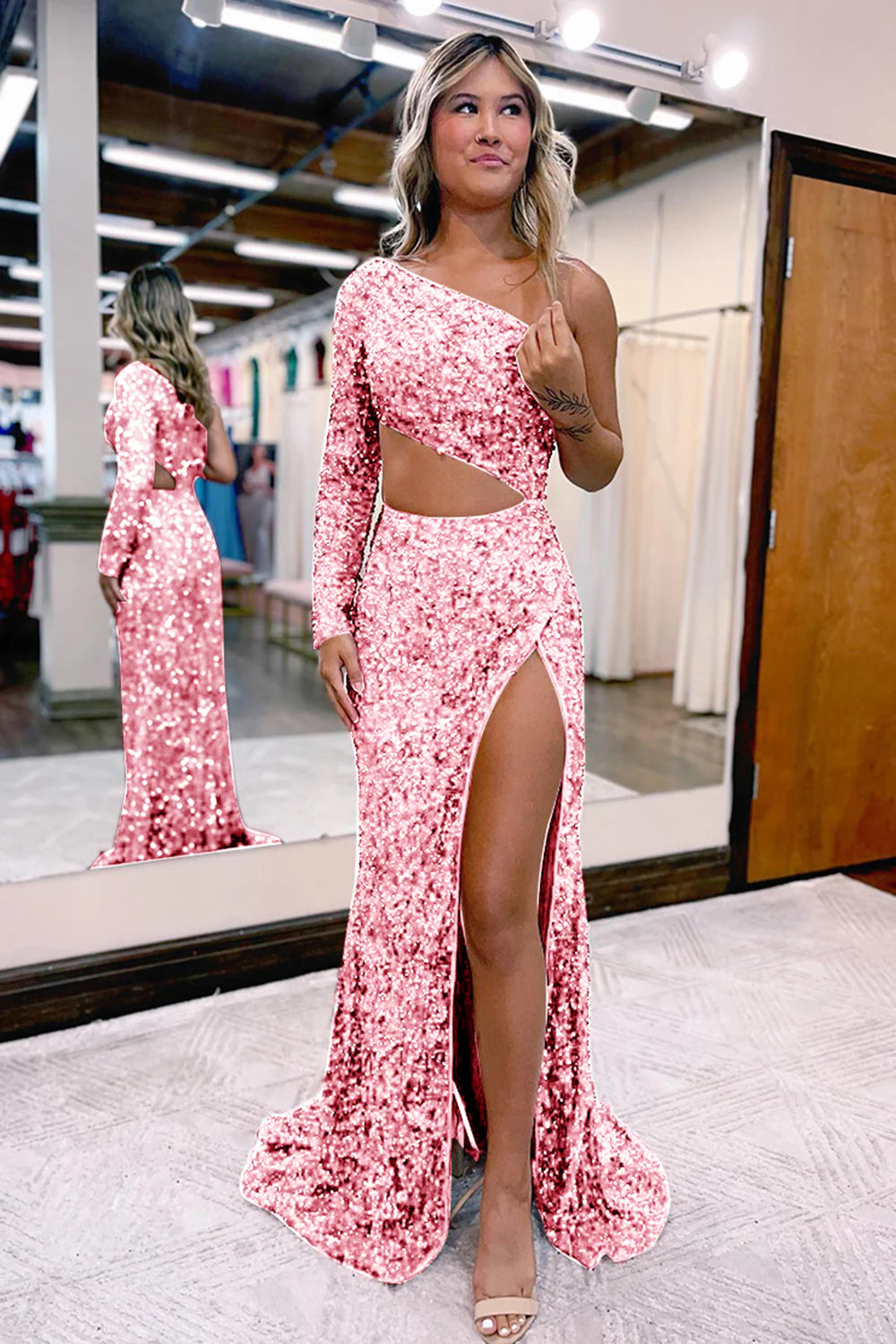Wholesa Sheath One Shoulder Sequins Long Prom Dress with Silt