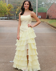 Wholesa Sheath Sparkly Spaghetti Straps Appliques Ruffles Yellow Long formal dresses evening gown Prom Dress with Slit - US 2 / UK 6 / EU 32
