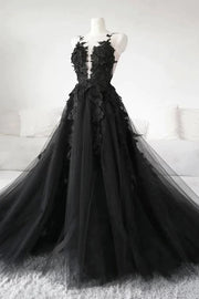 Wholesa Tulle Scoop Neck Prom Dresses A Line With Applique Sweep Train