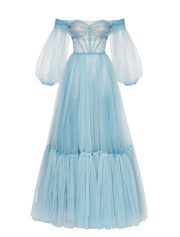 wholesale A-Line Elegant Sexy Wedding Guest Prom Dress Off Shoulder Long Sleeve Floor Length Tulle with Bow(s) Pleats - Dusty Blue / US 2 / UK 6 / EU 32