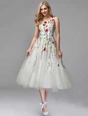 wholesale  A-Line Prom Dresses Floral Dress Engagement Formal Evening Tea Length Sleeveless Jewel Neck Chiffon with Lace Insert Appliques