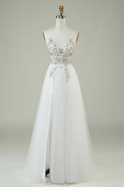 Wholesa A Line Spaghetti Straps Tulle Long Wedding Dress with Beading