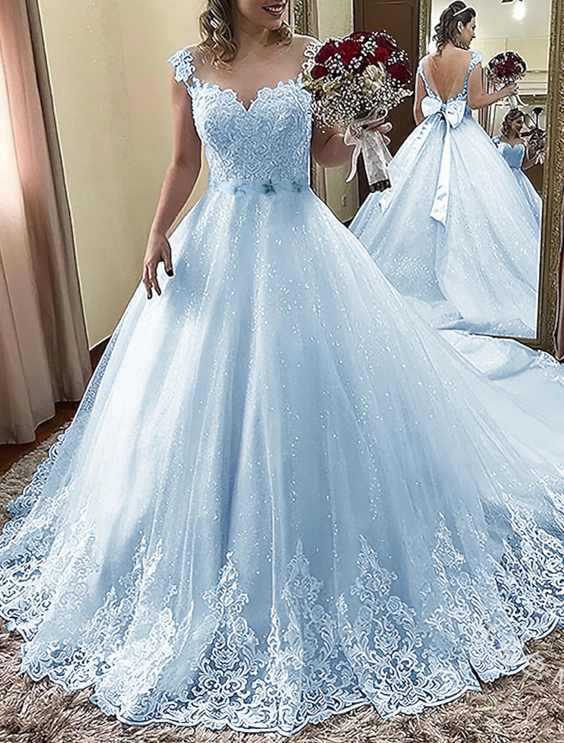 Wholesa Engagement Formal Wedding Dresses Ball Gown Illusion Neck Cap Sleeve Court Train Lace Bridal Gowns With Bow(s) Appliques - US 2 / UK 6 / EU 32