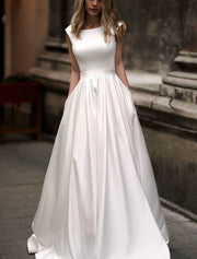 Wholesa Hall Simple Wedding Dresses A-Line Scoop Neck Cap Sleeve Court Train Satin Bridal Gowns With Pleats Summer Wedding Party