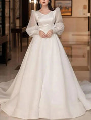 Wholesa Wholes Hall Formal Wedding Dresses A-Line V Neck Long Sleeve Chapel Train Satin Bridal Gowns With Solid Color - US 2 / UK 6 / EU 32